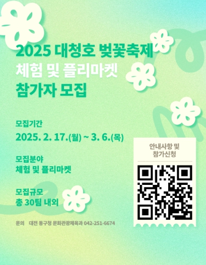 이번 2025 대청호 벚꽃축제는 화려한 공연보다는 자연과 벚꽃이 주인공이 되는 힐링형 피크닉 축제입니다. 🌳🌸 도심을 벗어나 대청호의 푸른 물결과 벚꽃이 어우러진 아름다운 풍경 속에서 다양한 문화 체험을 즐겨보세요!