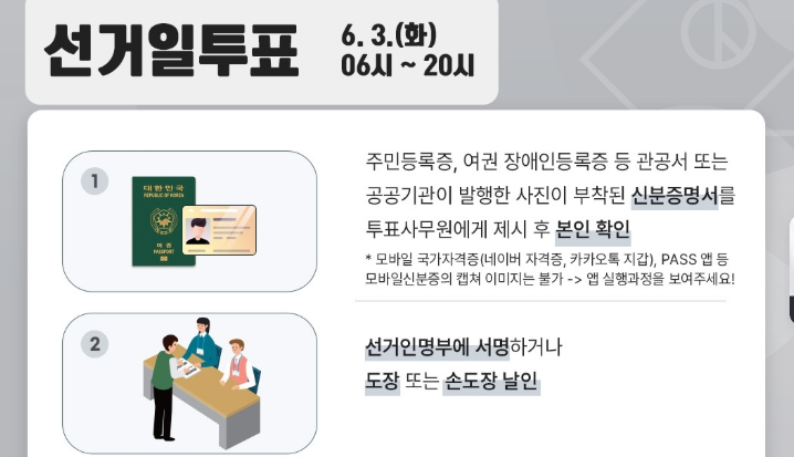 사전투표 기간에는 전국 어디서든 가까운 사전투표소에서 투표 가능하며, 신분증만 있으면 누구나 쉽게 투표할 수 있어요! 🪪✨