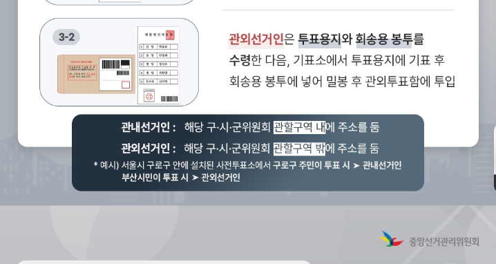 🔔 단, 관외투표의 경우 투표용지를 봉투에 넣어 제출하는 절차가 추가되므로