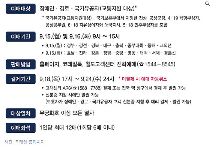 💡 이 기간에는 경로·장애인, 국가유공자 등이 우선적으로 예매할 수 있으며, 결제 기한은 9월 24일(수)까지입니다.