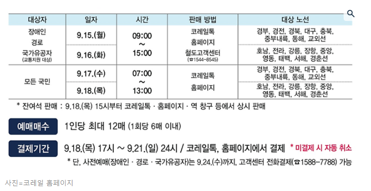 👉 일반 예매 승차권은 반드시 9월 21일 자정까지 결제해야 합니다.
